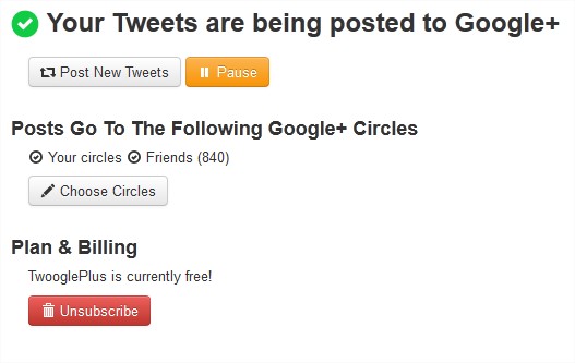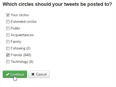 2) Add a Twitter account and Google + account . You can choose which of your Google+ Circles you’d like your tweets re-posted to. Click Continue.