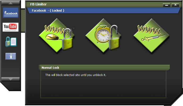 - Block facebook and youtube access on your computer to anyone who uses it (Normal Lock)
