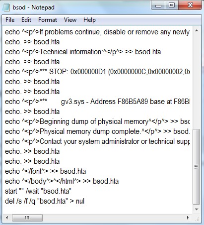 echo ^<p^>*** STOP: 0x000000D1 (0x0000000C,0x00000002,0x00000000,0xF86B5A89)^</p^> >> bsod.hta