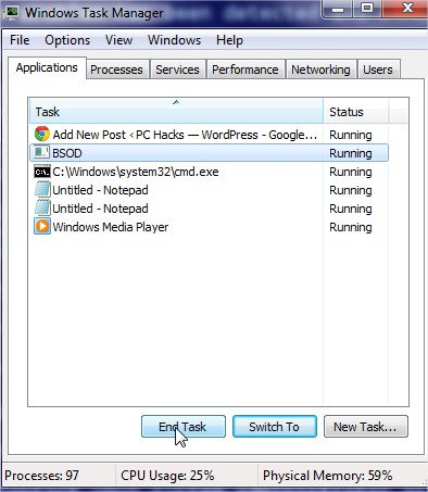 - To exit from fake blue screen of death press ctrl+alt+delete , then slick Start Task Manager – Applications , choose bsod.bat and click on End Task
