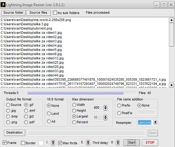 2) Run Lightning Image Resizer and select source folder, set up options that you want and click start . All images from source folder can be edited in one click.